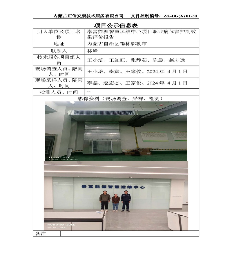 泰富能源智慧運維中心項目職業(yè)病危害控制效果評價