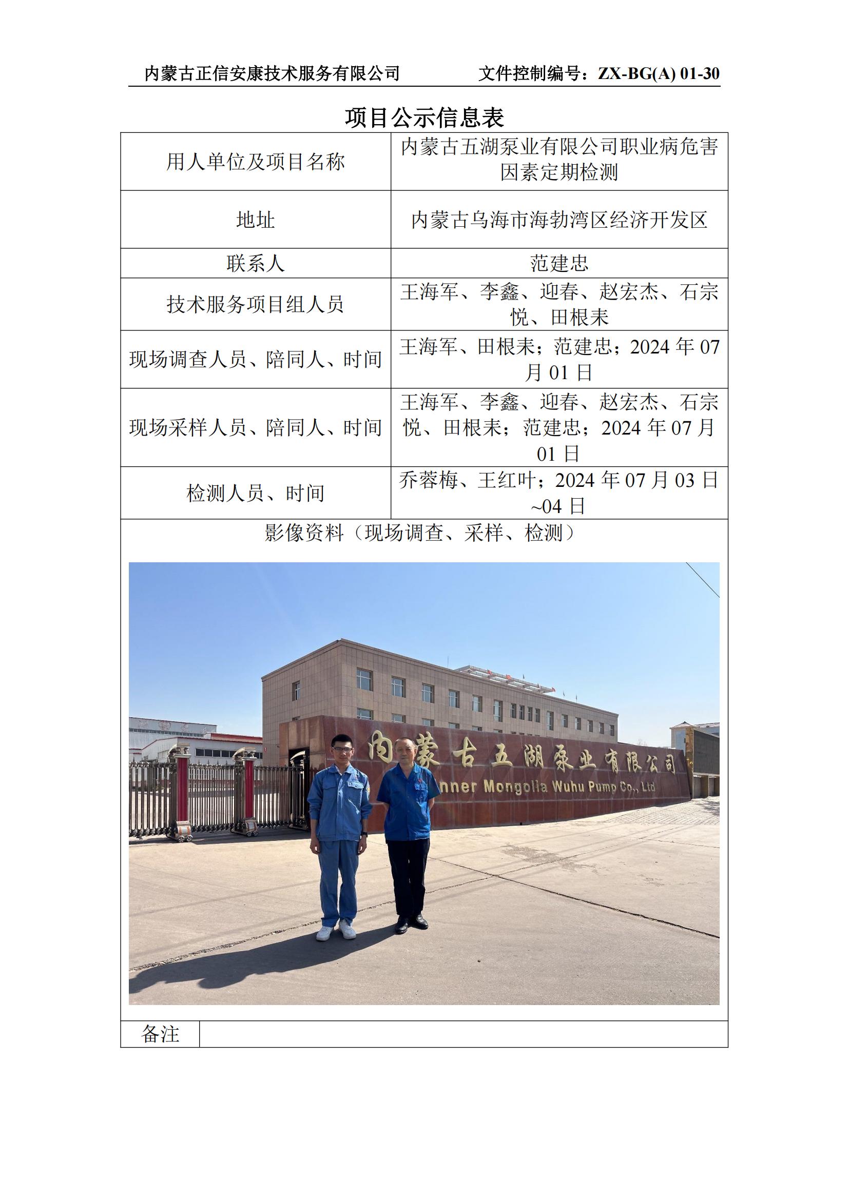 內(nèi)蒙古五湖泵業(yè)有限公司職業(yè)病危害 因素定期檢測