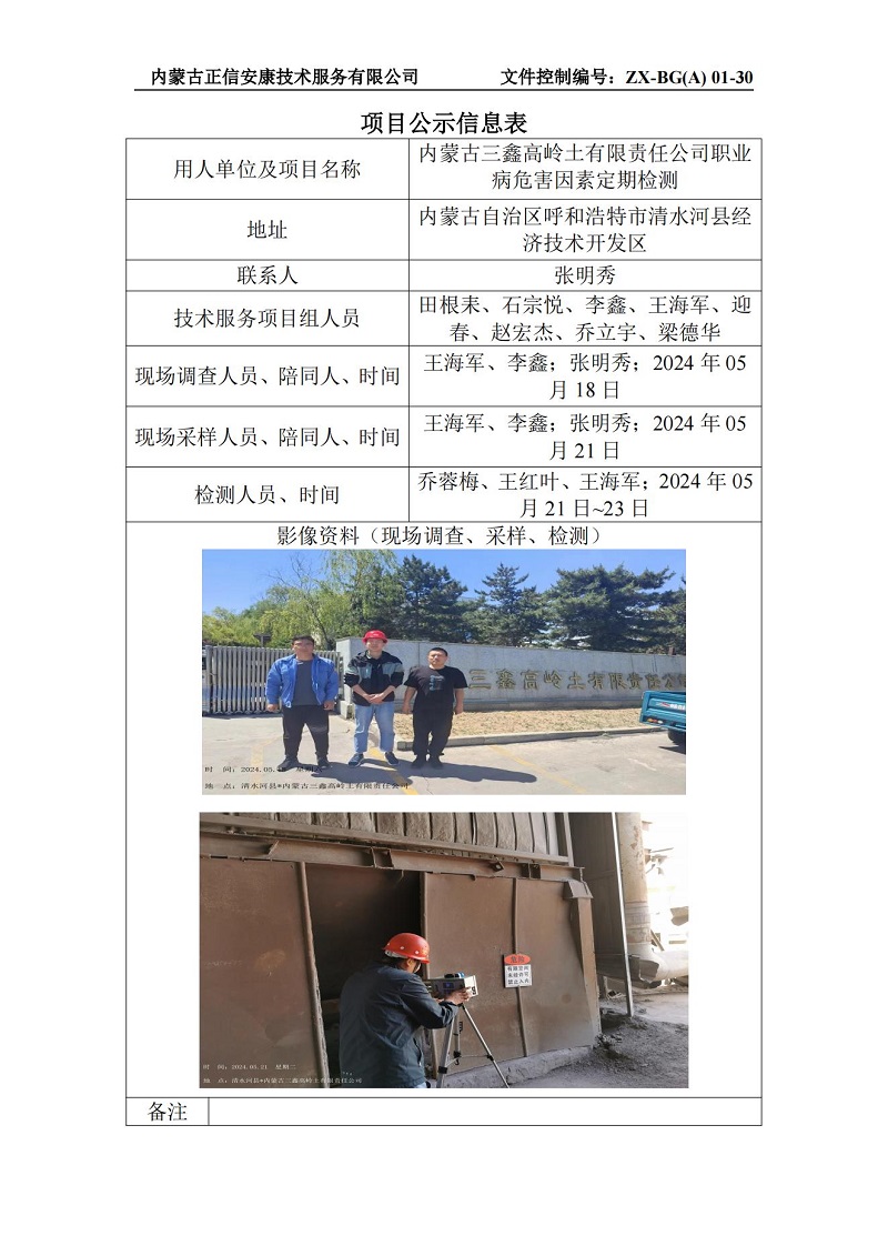 內(nèi)蒙古三鑫高嶺土有限責任公司職業(yè)病危害因素定期檢測
