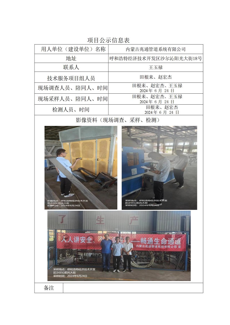 內(nèi)蒙古兆通管道系統(tǒng)有限公司職業(yè)病危害因素定期檢測