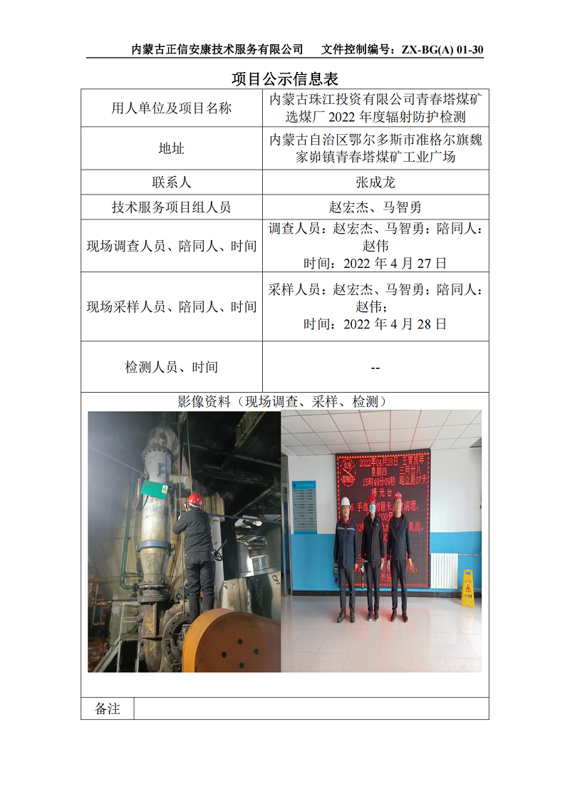 內(nèi)蒙古珠江投資有限公司青春塔煤礦選煤廠2022年度輻射防護(hù)檢測