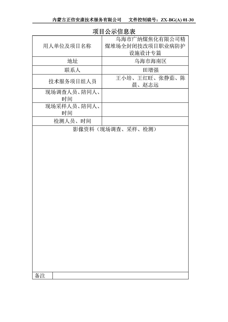 烏海市廣納煤焦化有限公司精煤堆場(chǎng)全封閉技改項(xiàng)目職業(yè)病防護(hù)設(shè)施設(shè)計(jì)專篇項(xiàng)目公示