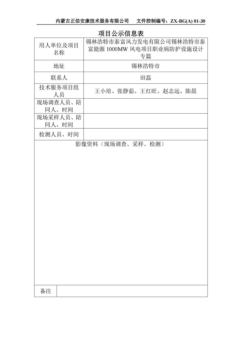 錫林浩特市泰富風力發(fā)電有限公司錫林浩特市泰富能源1000MW風電項目職業(yè)病防護設施設計專篇公示信息表