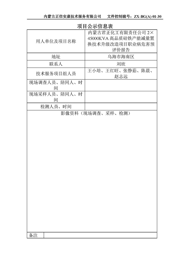 內(nèi)蒙古君正化工有限責(zé)任公司2×45000KVA高品質(zhì)硅鐵產(chǎn)能減量置換技術(shù)升級(jí)改造項(xiàng)目職業(yè)病危害預(yù)評(píng)價(jià)報(bào)告