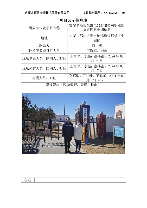 鄂爾多斯市恒凱電器有限公司職業(yè)病危害因素定期檢測