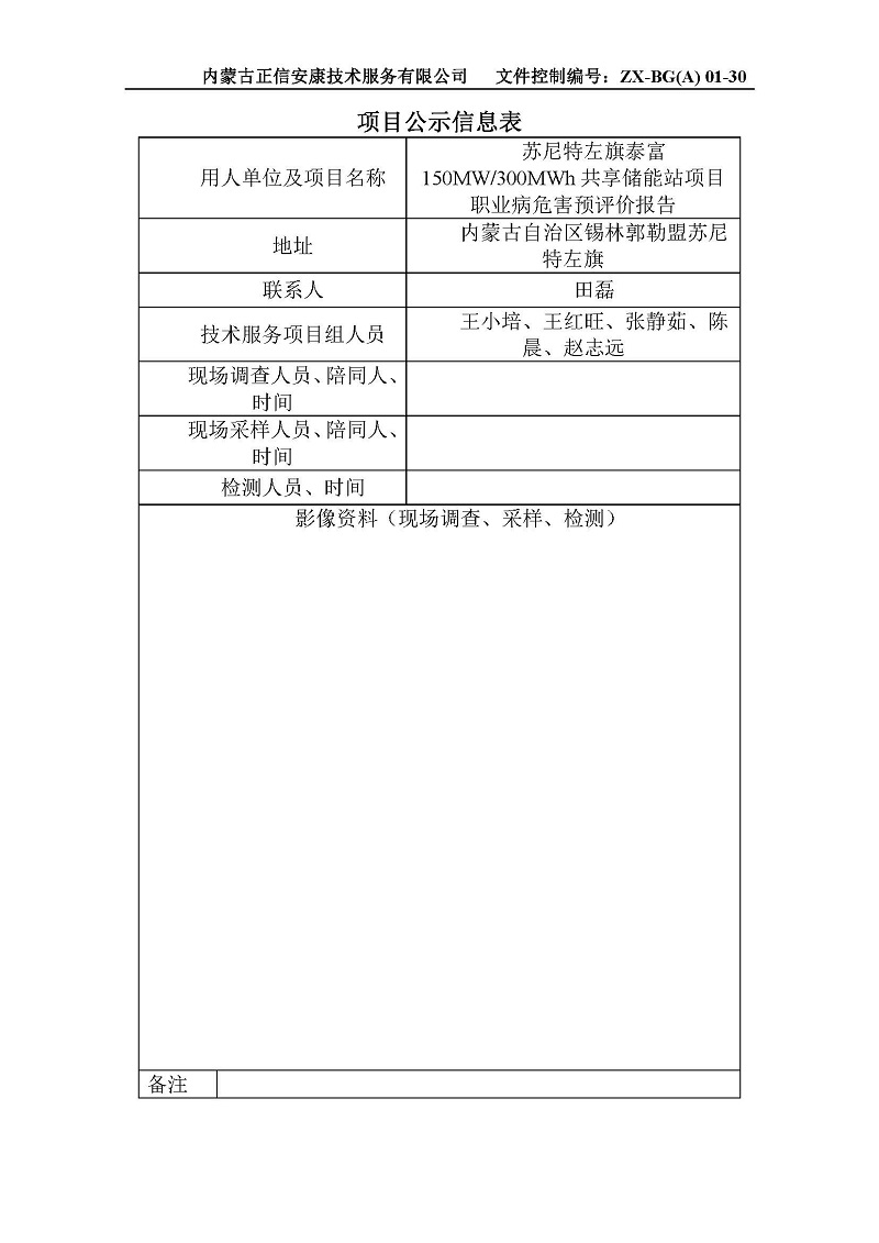 蘇尼特左旗泰富150MW300MWh共享儲(chǔ)能站項(xiàng)目職業(yè)病危害預(yù)評(píng)價(jià)報(bào)告信息公示表