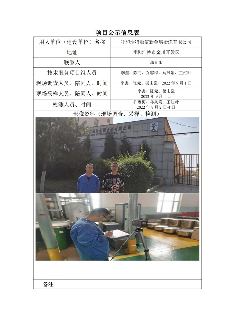 呼和浩特融信新金屬冶煉有限公司職業(yè)衛(wèi)生定期檢測