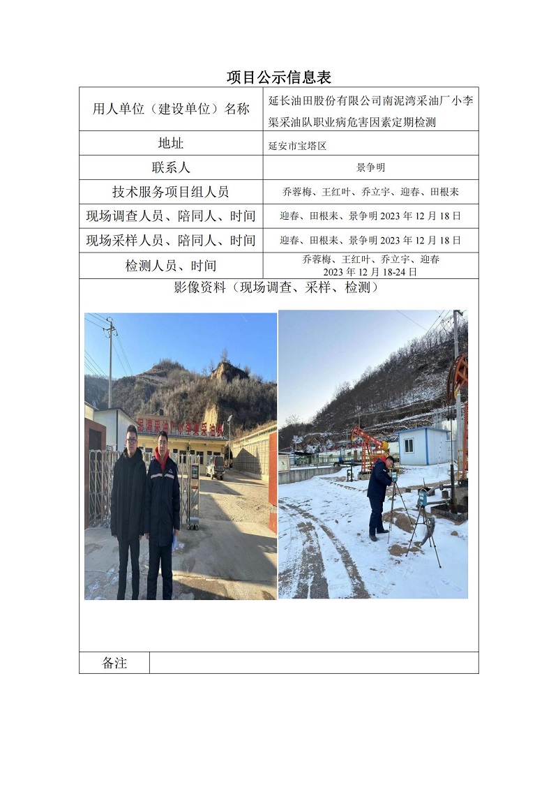 延長油田股份有限公司南泥灣采油廠小李渠采油隊職業(yè)病危害因素定期檢測