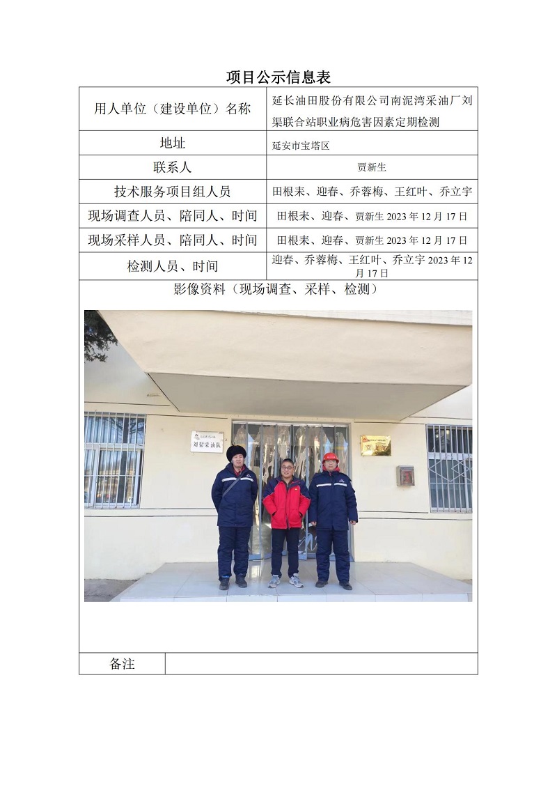 延長(zhǎng)油田股份有限公司南泥灣采油廠劉渠聯(lián)合站職業(yè)病危害因素定期檢測(cè)_