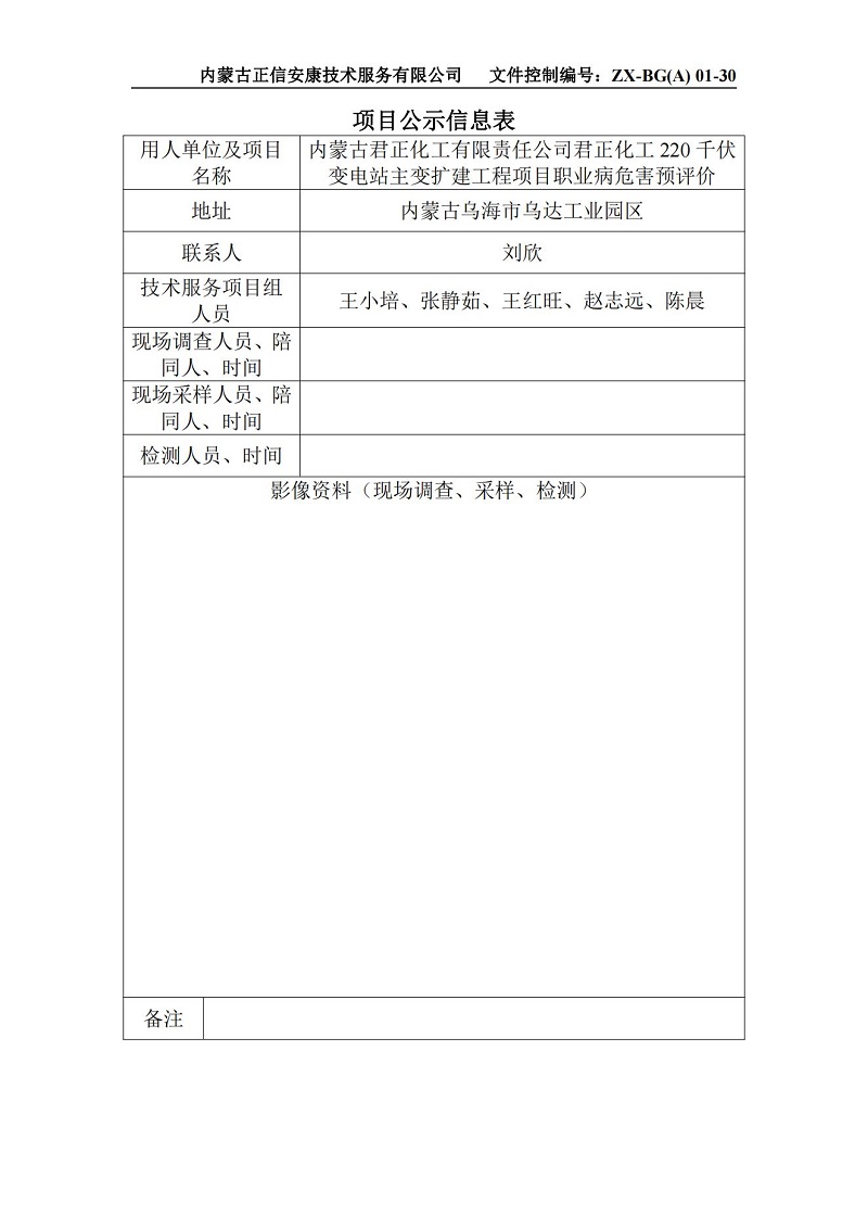 內(nèi)蒙古君正化工有限責(zé)任公司君正化工220千伏變電站主變擴(kuò)建工程項目職業(yè)病危害預(yù)評價項目公示信息表