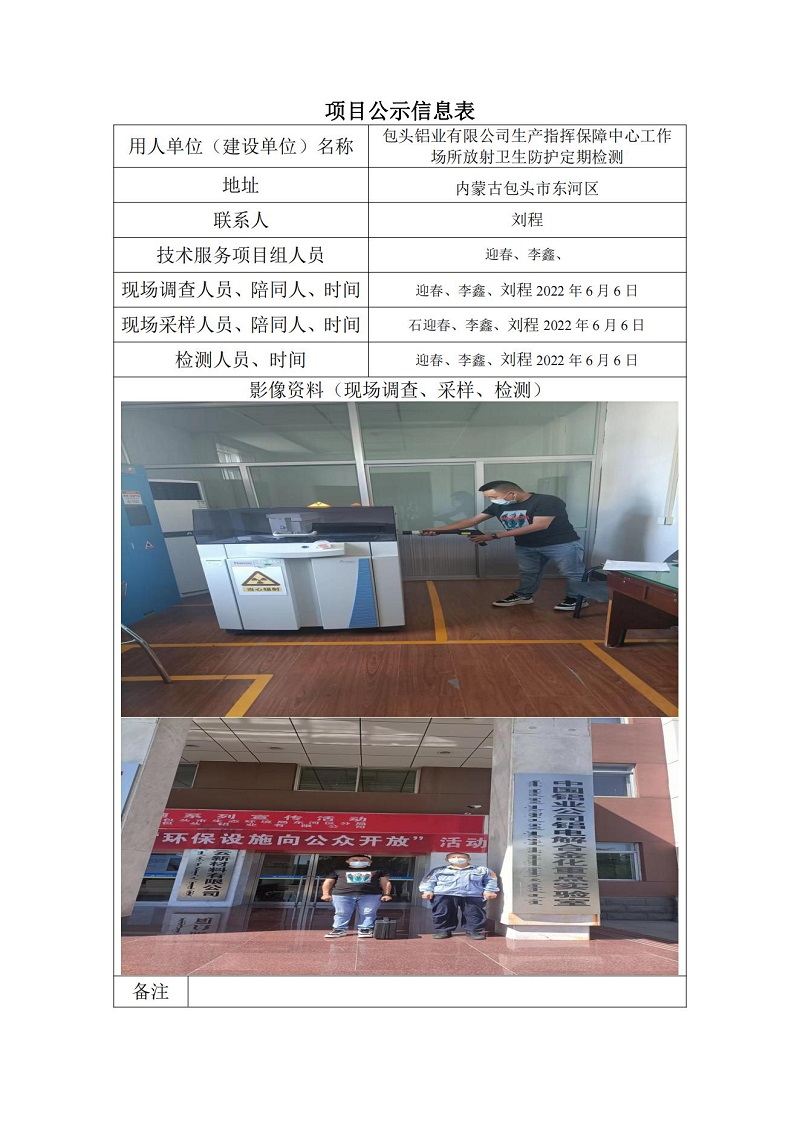 包頭鋁業(yè)有限公司生產(chǎn)指揮保障中心工作場所放射定期檢測(cè)項(xiàng)目公示