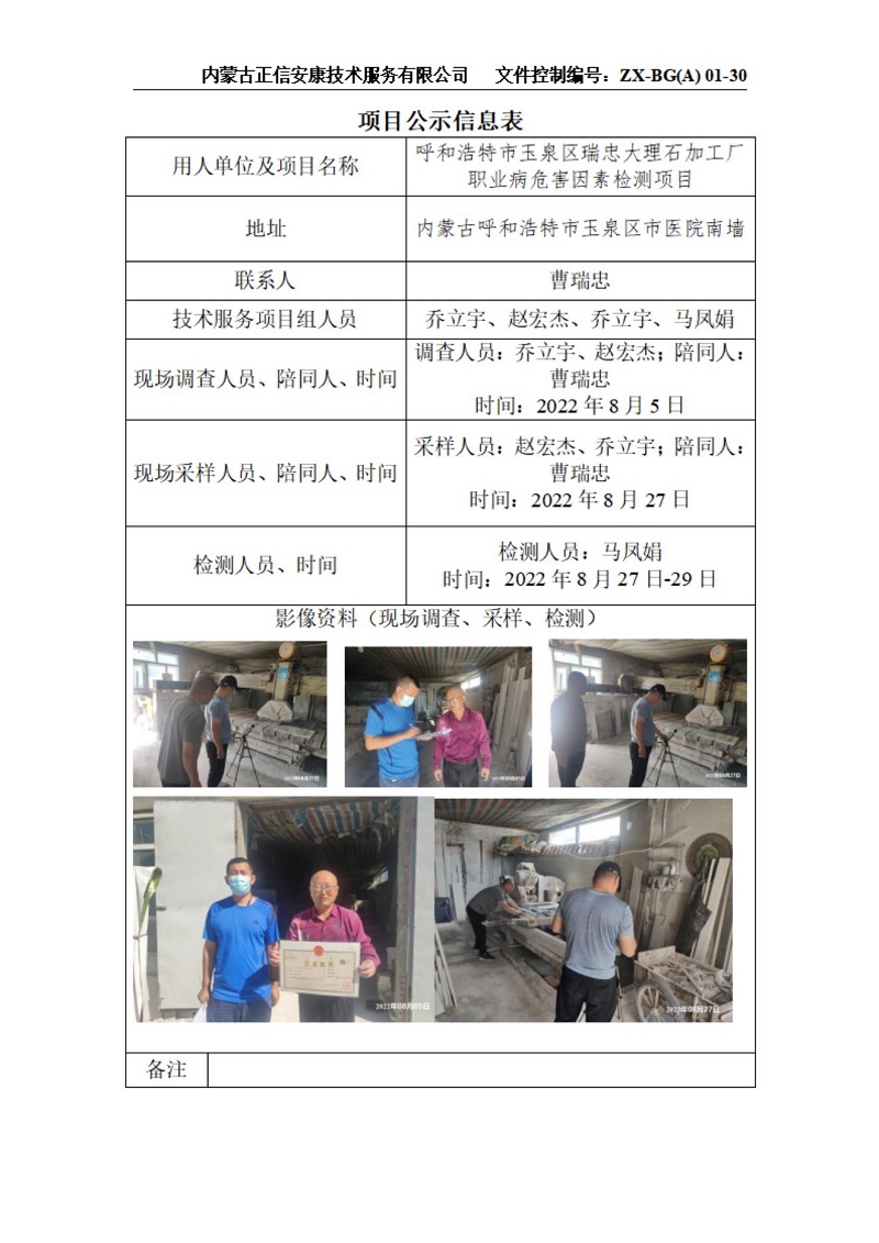 呼和浩特市玉泉區(qū)瑞忠大理石加工廠職業(yè)病危害因素檢測項(xiàng)目公示信息表