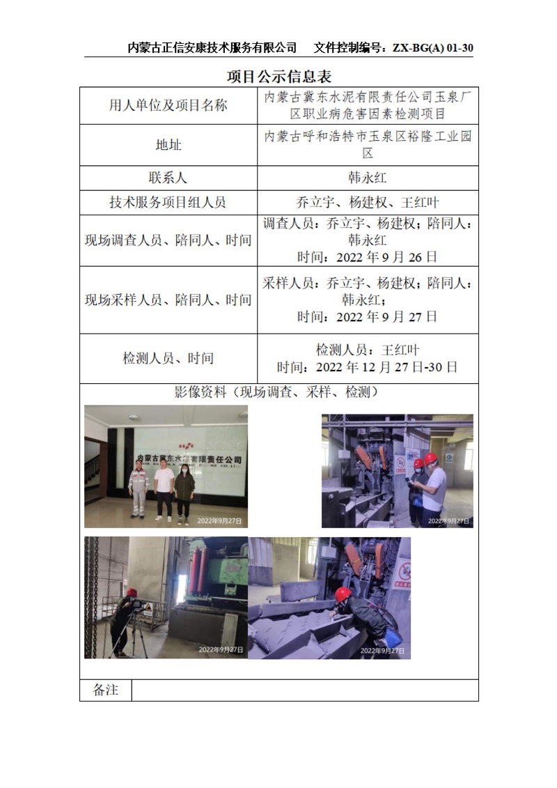內(nèi)蒙古冀東水泥有限責任公司玉泉廠區(qū)職業(yè)病危害因素檢測項目公示信息表