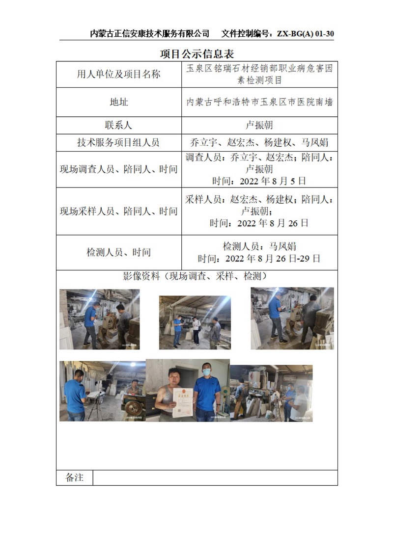 玉泉區(qū)銘瑞石材經(jīng)銷部職業(yè)病危害因素檢測(cè)項(xiàng)目公示信息表