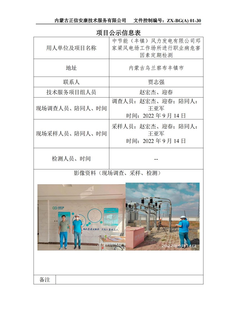中節(jié)能(豐鎮(zhèn))風(fēng)力發(fā)電有限公司鄧家梁風(fēng)電場(chǎng)工作場(chǎng)所進(jìn)行職業(yè)病危害因素定期檢測(cè)