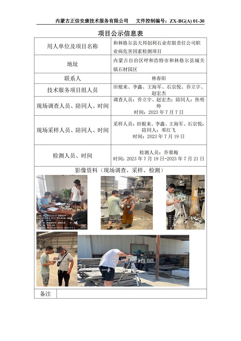 和林格爾縣天邦創(chuàng)利石業(yè)有限責(zé)任公司職業(yè)病危害因素檢測項目公示信息表