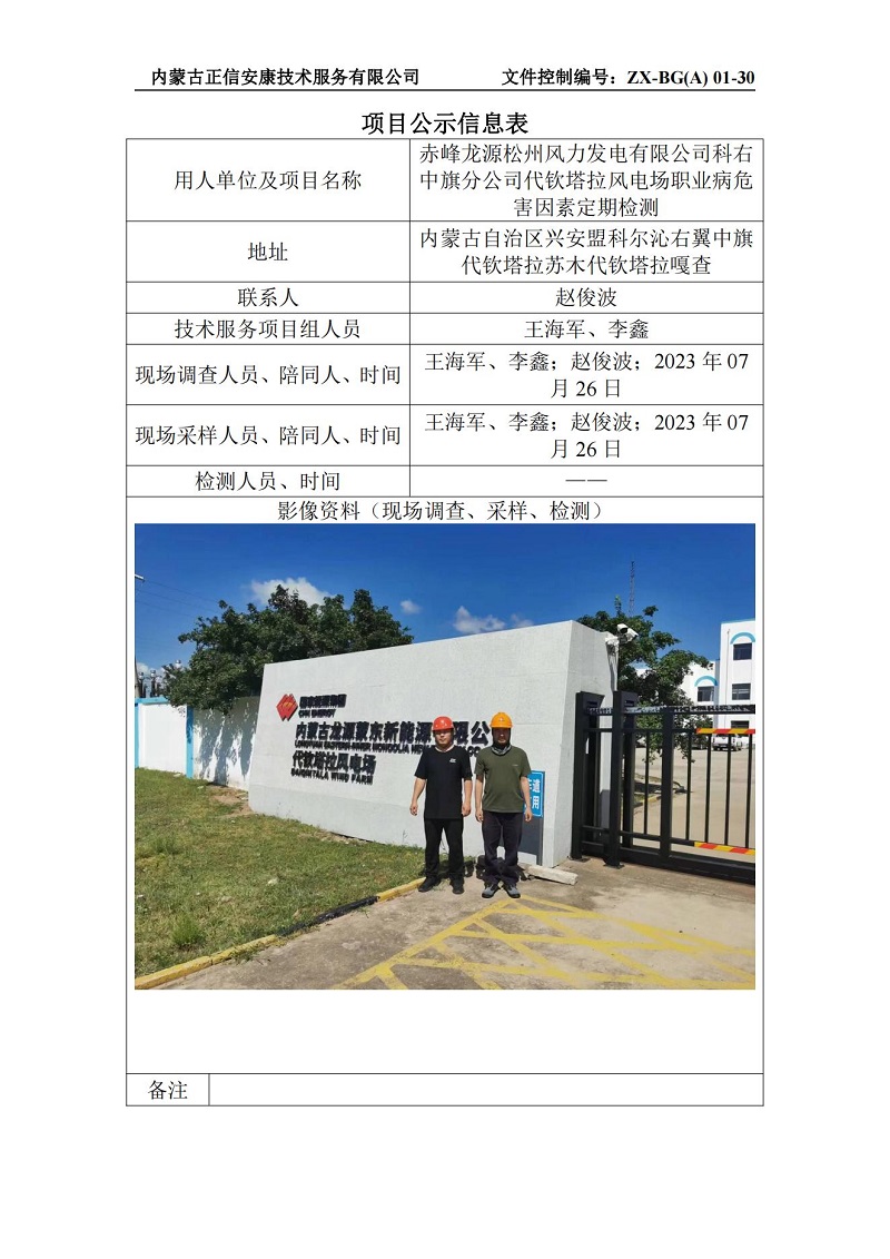 赤峰龍?jiān)此芍蒿L(fēng)力發(fā)電有限公司科右中旗分公司代欽塔拉風(fēng)電場職業(yè)病危害因素定期檢測