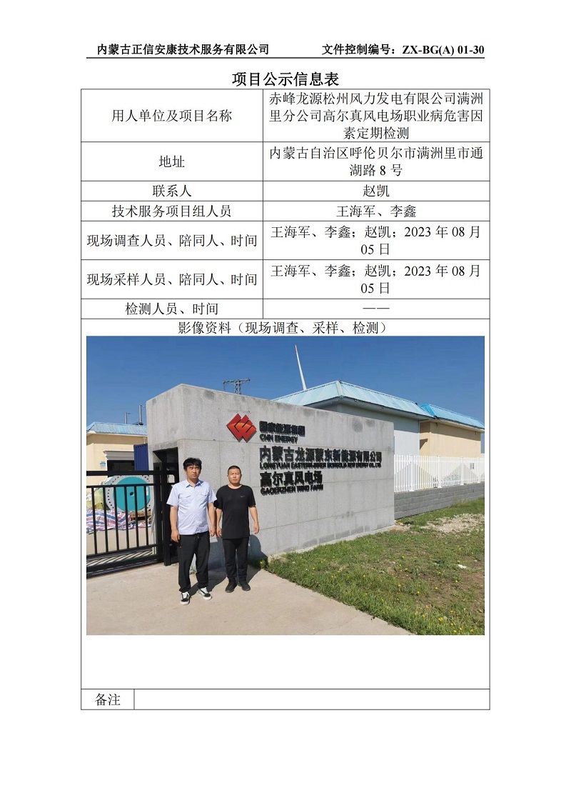 赤峰龍源松州風(fēng)力發(fā)電有限公司滿洲里分公司高爾真風(fēng)電場職業(yè)病危害因素定期檢測
