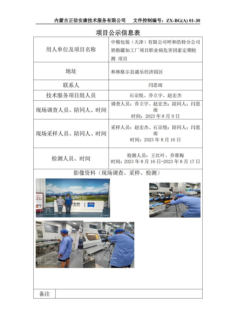 中糧包裝(天津)有限公司呼和浩特分公司奶粉罐加工廠項(xiàng)目職業(yè)病危害因素定期檢測(cè) 項(xiàng)目公示信息表