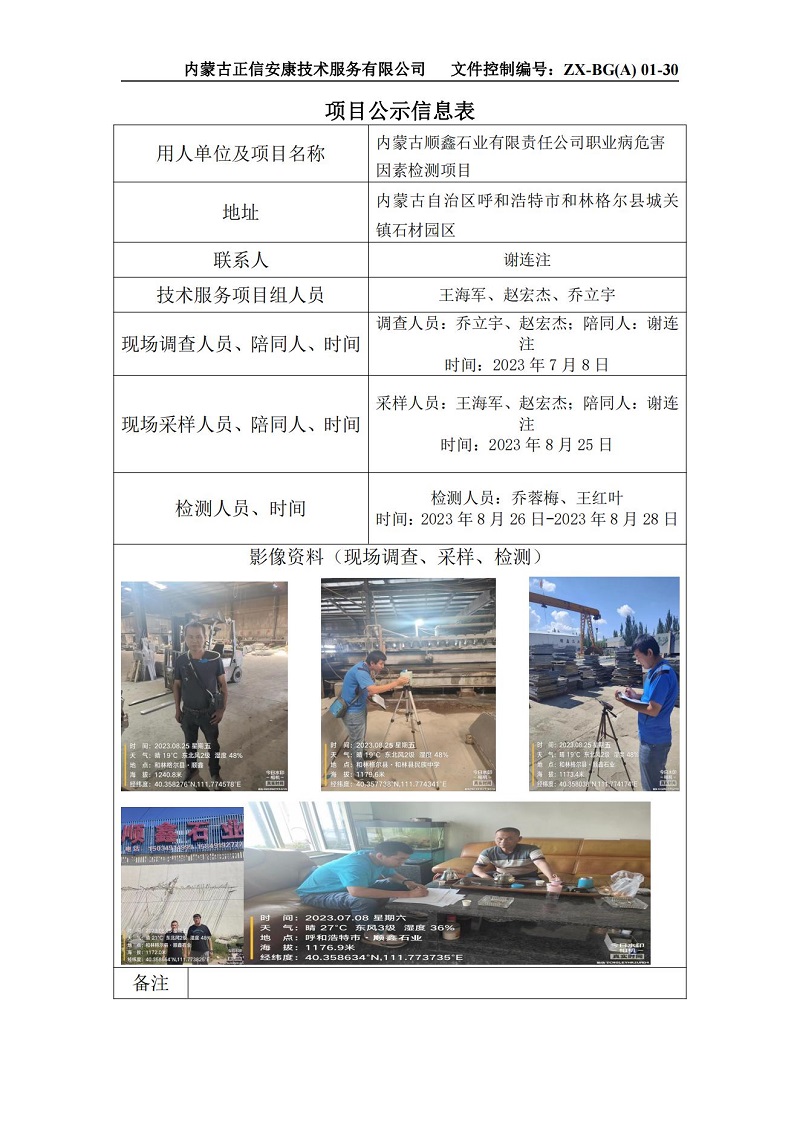 內(nèi)蒙古順鑫石業(yè)有限責任公司職業(yè)病危害因素檢測項目公示信息表
