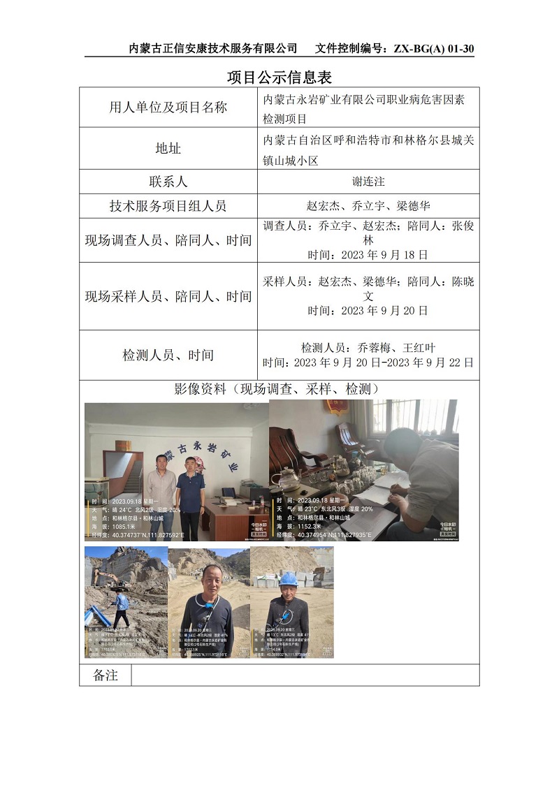 內(nèi)蒙古永巖礦業(yè)有限公司職業(yè)病危害因素檢測項目公示信息表