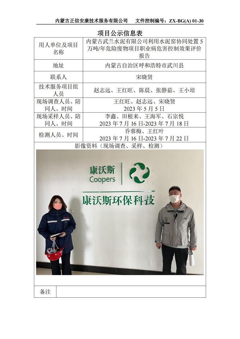 內(nèi)蒙古武蘭水泥有限公司利用水泥窯協(xié)同處置5萬噸年危險廢物項目職業(yè)病危害控制效果評價報告-項目公示信息表