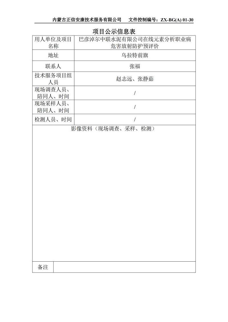 巴彥淖爾中聯(lián)水泥有限公司在線元素分析職業(yè)病危害放射防護(hù)預(yù)評(píng)價(jià)-項(xiàng)目公示信息表