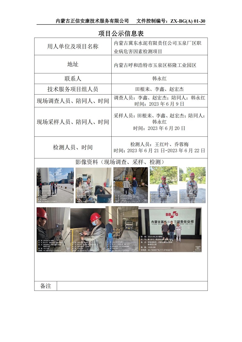 內(nèi)蒙古冀東水泥有限責任公司玉泉廠區(qū)項目職業(yè)病危害因素 項目公示信息表_