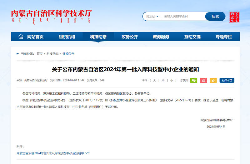 熱烈祝賀公司成功申報(bào)內(nèi)蒙古自治區(qū)2024年第一批入庫(kù)科技型中小企業(yè)