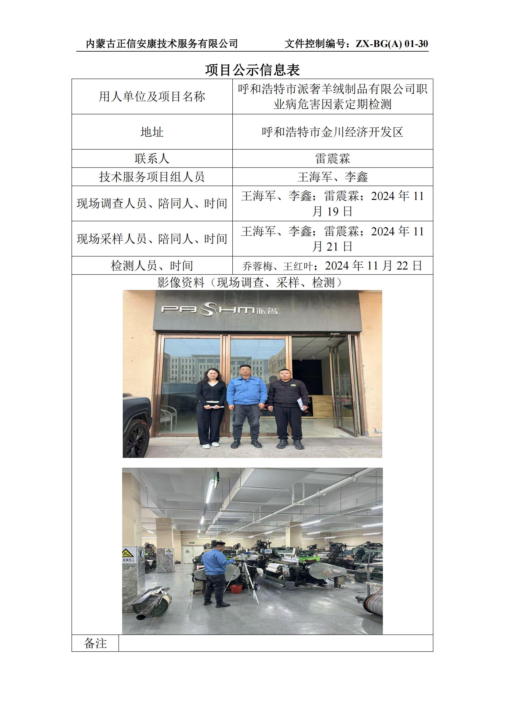 呼和浩特市派奢羊絨制品有限公司職業(yè)病危害因素定期檢測
