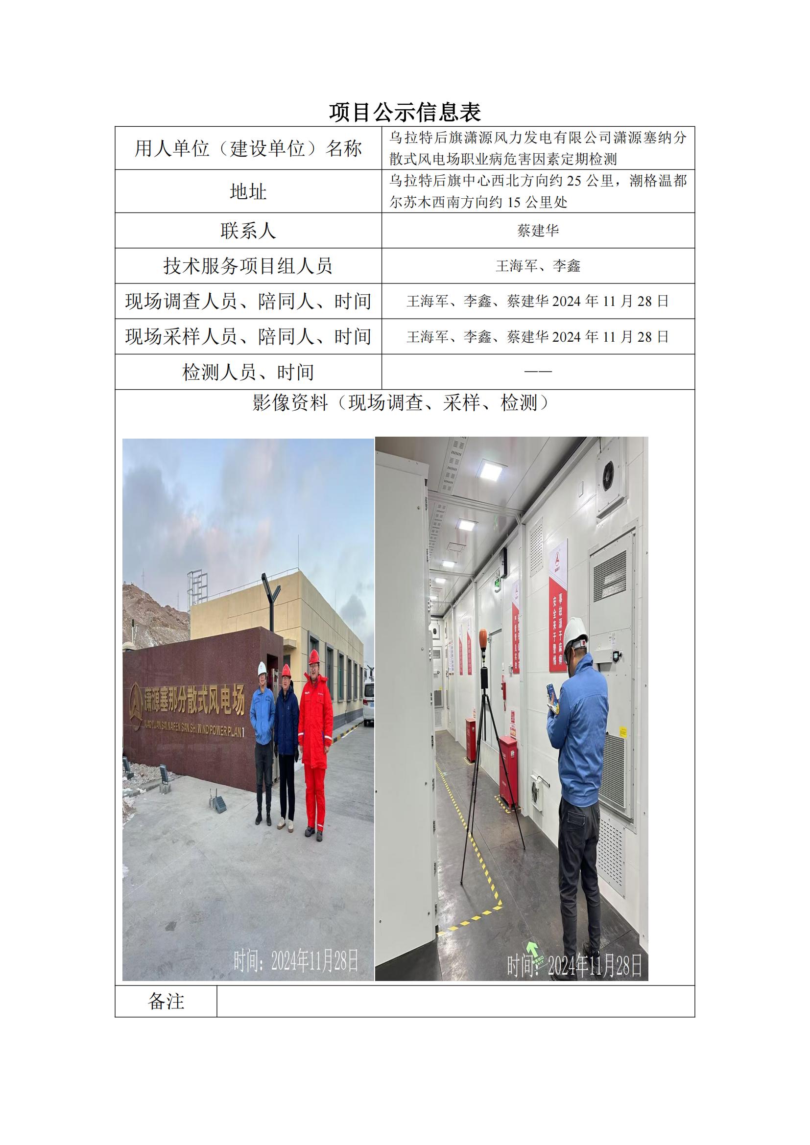 烏拉特后旗瀟源風力發(fā)電有限公司瀟源塞納分散式風電場職業(yè)病危害因素定期檢測