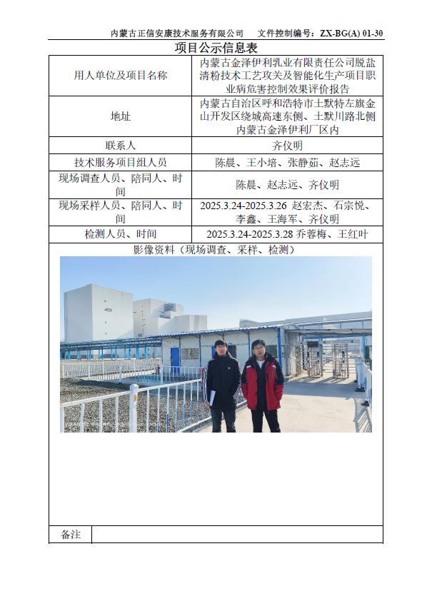 內(nèi)蒙古金澤伊利乳業(yè)有限責(zé)任公司脫鹽清粉技術(shù)工藝攻關(guān)及智能化生產(chǎn)項目職業(yè)病危害控制效果評價報告